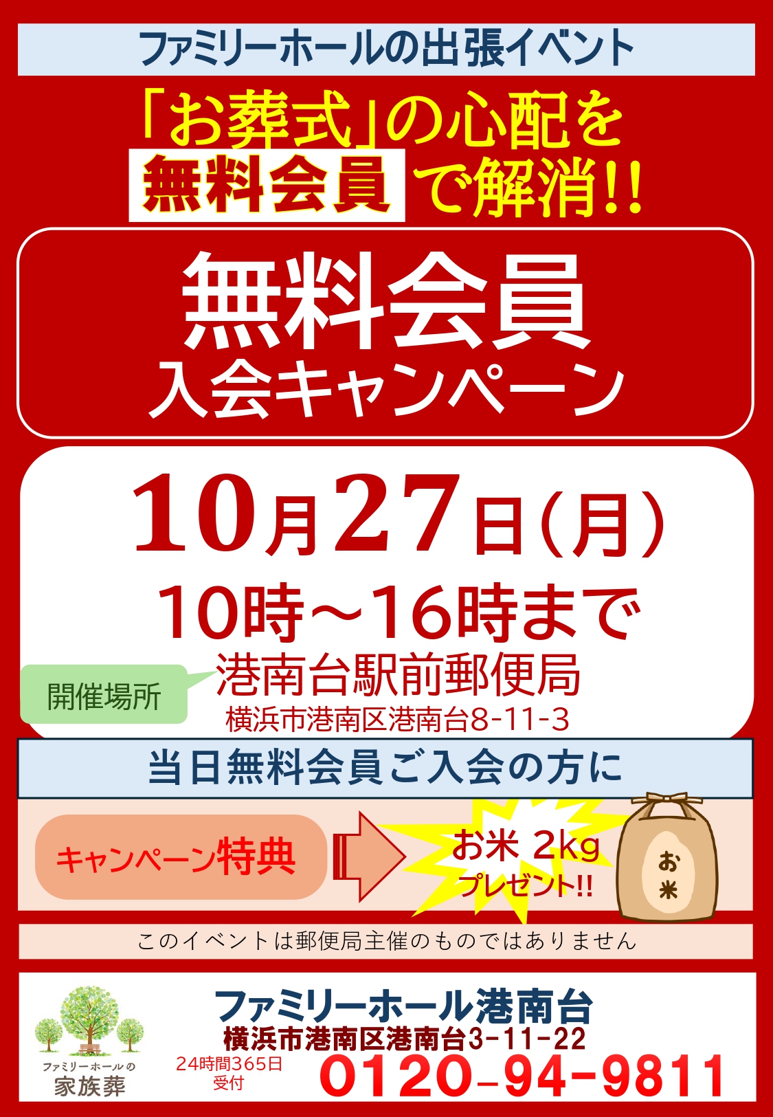 【お葬式無料会員入会キャンペーンのお知らせ】10/4(土)、10/5(日)、10/16(木)、10/17(金)、10/25(土)、10/26(日)、10/30(木)、10/31(金)