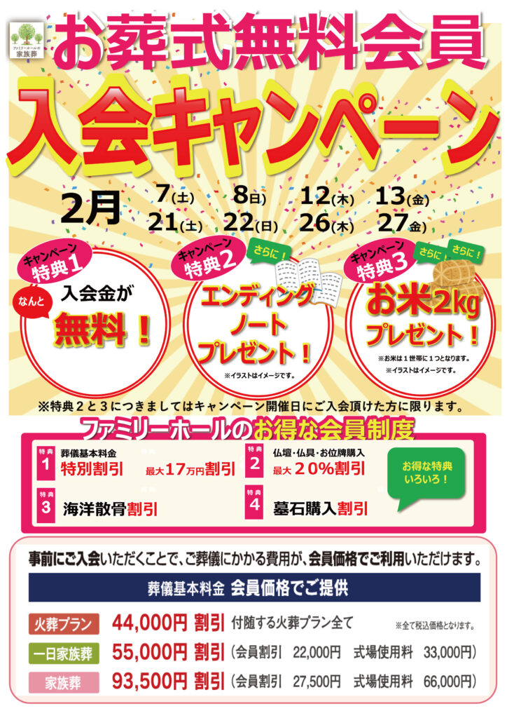 【お葬式無料会員入会キャンペーンのお知らせ】2/7(土)、8(日)、12(木)、13(金)、21(土)、22(日)、26(木)、27(金)